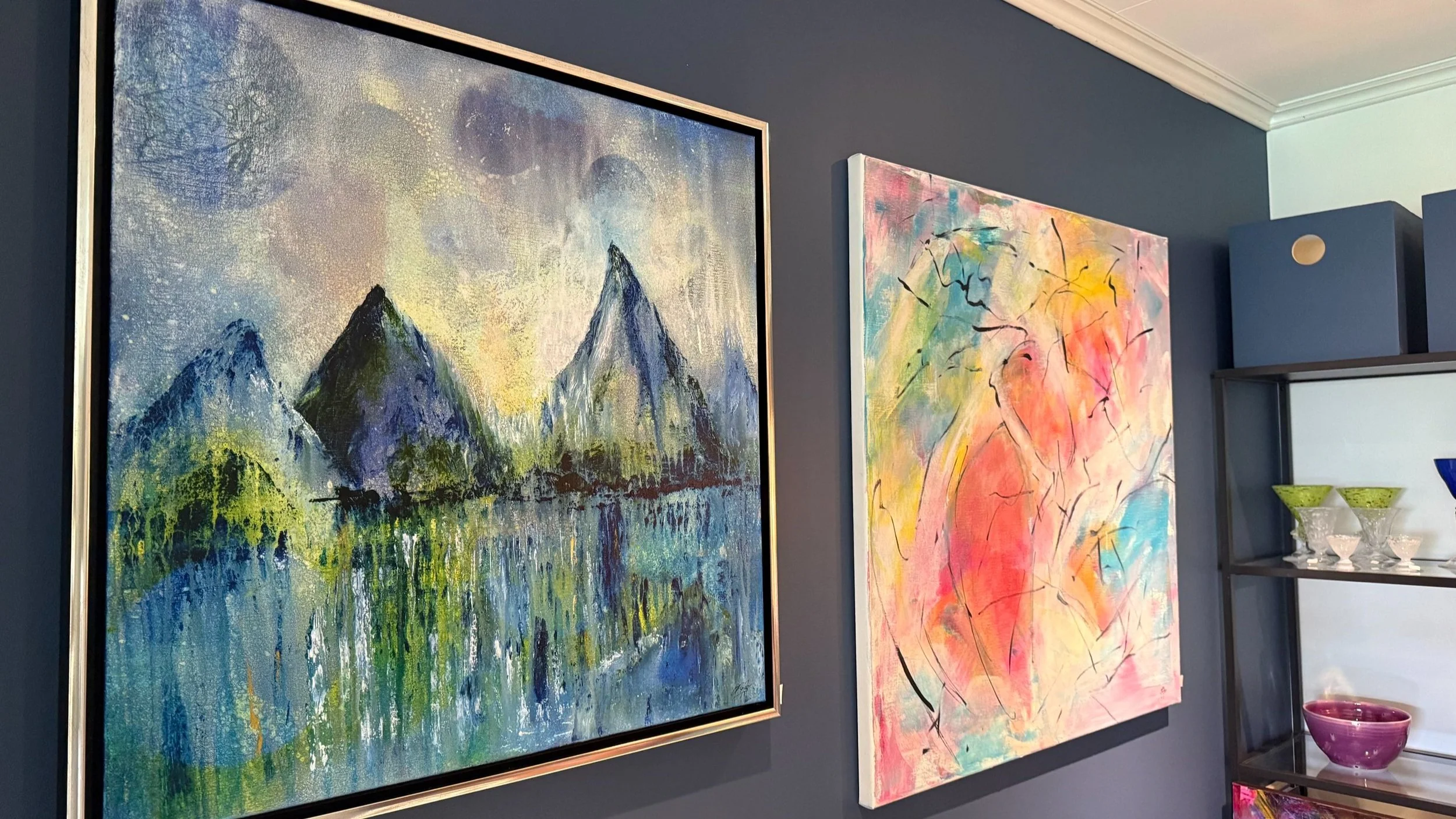 Alle malerier er innrammet med trerammer (aldri plast eller metall) av rammemaker Bjørn Besvold.
